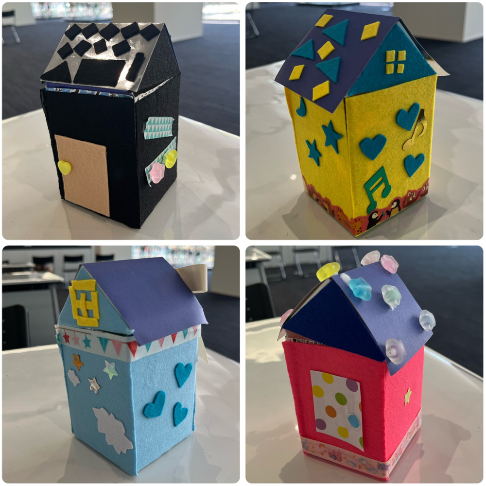 牛乳パックにフェルトを貼り付け、カラーペーパーで屋根を作り、自由に壁や屋根を飾り付けていただきました。