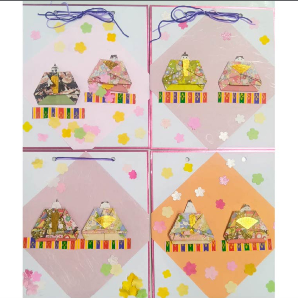 華やかな折り紙で作ったおひなさまを色紙に貼り付け、紙で作った花を周りにちりばめて出来上がりです。
