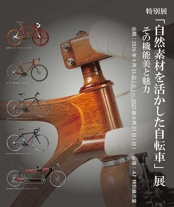 そこで令和8年度特別展では、普段中々見られない天然素材を使用した自転車5台を展示し、製作工程など作者の想いを解説しています。