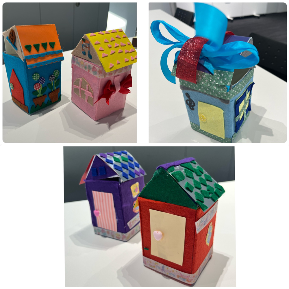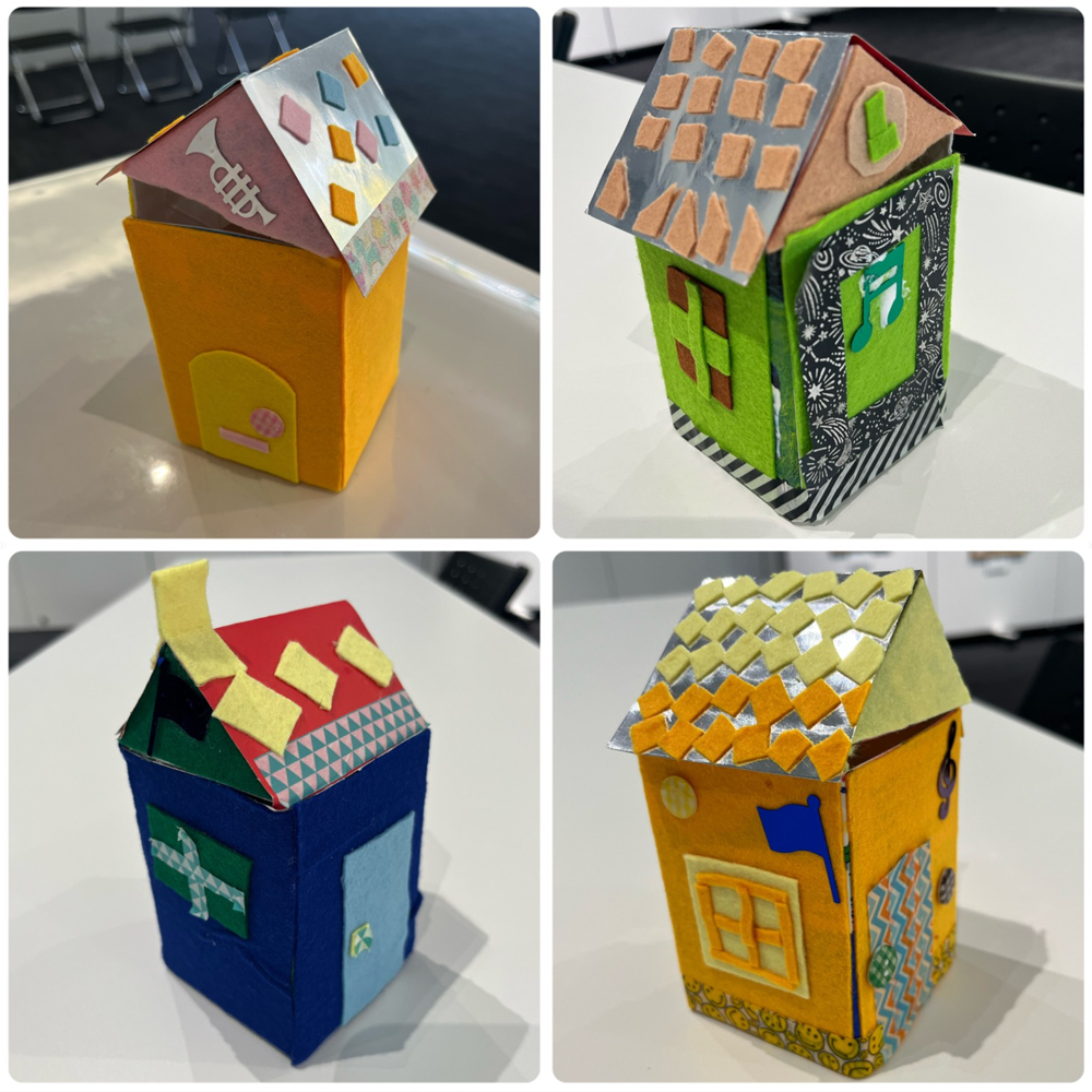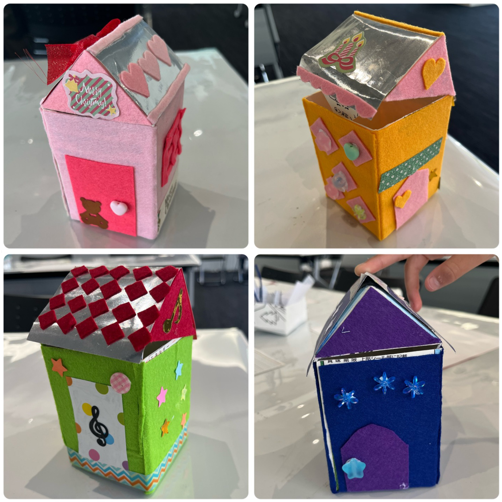 牛乳パックにフェルトを貼り付け、カラーペーパーで屋根を作り、自由に壁や屋根を飾り付けていただきました。