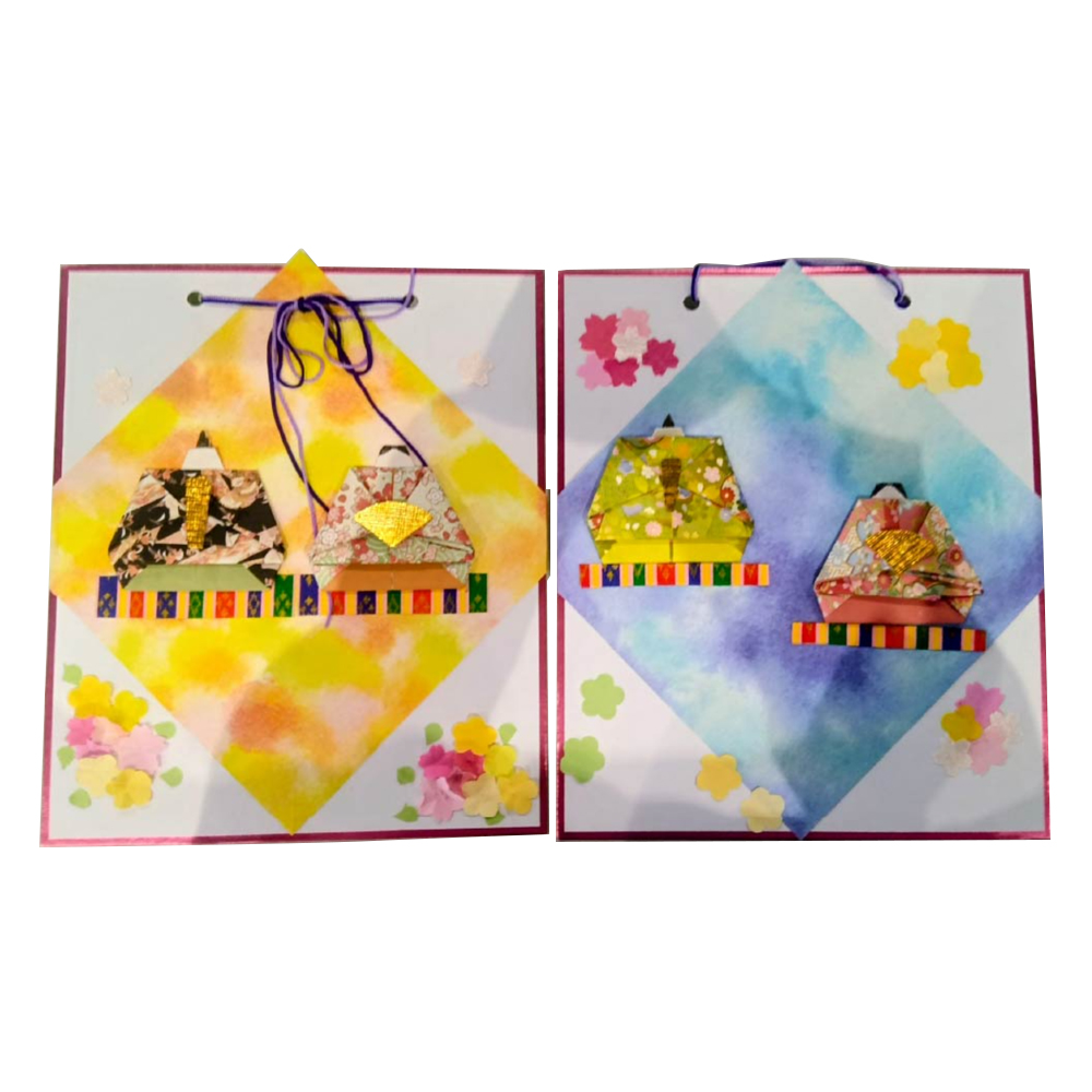 華やかな折り紙で作ったおひなさまを色紙に貼り付け、紙で作った花を周りにちりばめて出来上がりです。