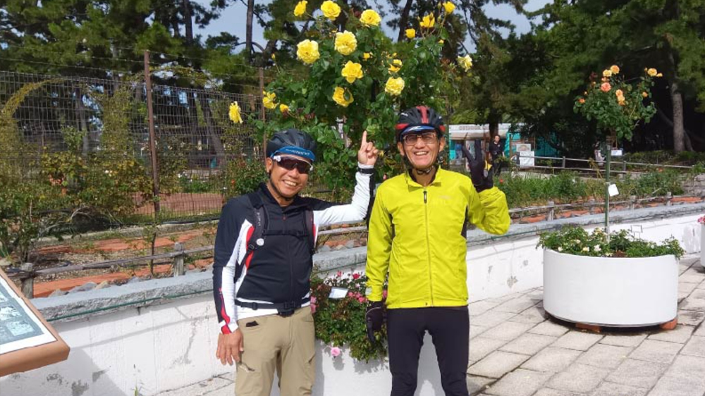 高校生選手の闊達に動く姿を見ながら高師浜の港で休憩。漁船の前でほっこりタイム。次に浜寺公園に入り、秋のイベント中のバラ園に入ります。黄色、赤色などなど、綺麗に咲いたバラを見ながら庭園内をおしゃべりしながら散歩。