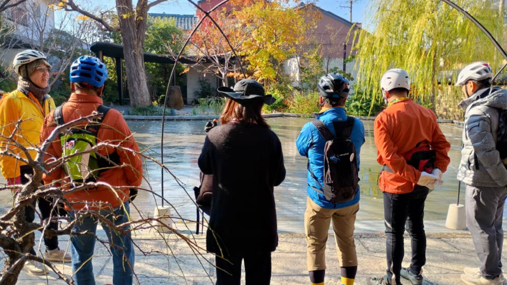 朝は冷え込みましたが風もなく気持ちの良い晴天。日曜日で車も少なく清々しい朝の空気の中自転車博物館を出発。この日は観光ボランティア協会の方に見どころの解説をしてもうらう贅沢な自転車散歩です。